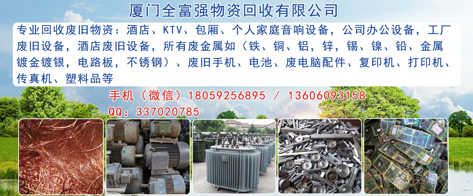 廈門(mén)全富強(qiáng)物資回收,是一家專(zhuān)業(yè)的新型服務(wù)回收廢舊物資企業(yè)。擁有豐富多年的工作經(jīng)驗(yàn),多方面的信息渠道,我們堅(jiān)持誠(chéng)信、公平競(jìng)爭(zhēng)、薄利多銷(xiāo)的服務(wù)理念。業(yè)務(wù)范圍:回收廚房設(shè)備、KTV音響舞臺(tái)設(shè)備,個(gè)人家庭音響設(shè)備,報(bào)廢電梯、二手車(chē)買(mǎi)賣(mài)、酒店設(shè)備 、醫(yī)療設(shè)備,學(xué)校設(shè)備,建筑設(shè)備,商場(chǎng)餐廳設(shè)備,辦公設(shè)備、中央空調(diào)、廢電纜、變壓器、廢電機(jī)、庫(kù)存物資、家用電器如空調(diào)、冰箱,洗衣機(jī),熱水器 ,液晶電視,臺(tái)式電腦,筆記本電腦,傳真機(jī)、打印機(jī)、復(fù)印機(jī)、名表,古鐘,古畫(huà),古瓷,金銀首飾,木雕,石雕,銅雕,玉雕,古老雕刻藝術(shù)品,以及其他古董。廢品回收、大量鐵,銅,鋁等一切廢舊金屬。